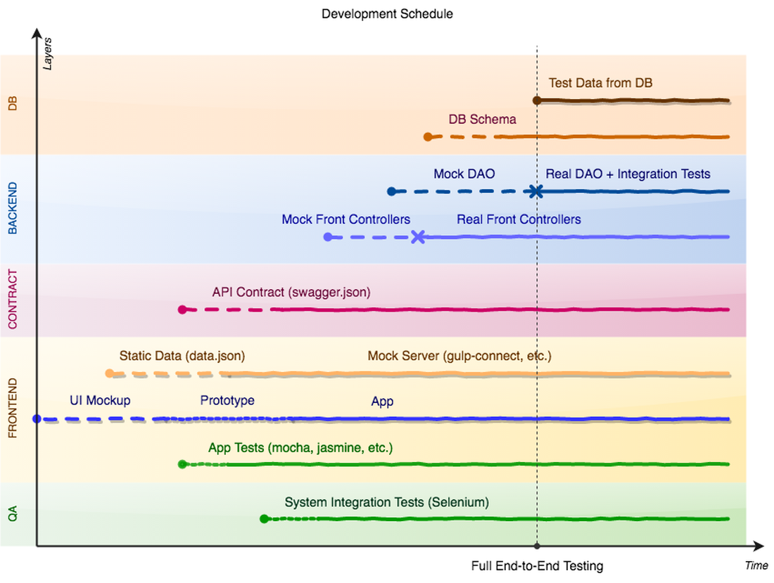 Let’s assume we’re developing a web application that consumes a REST/WebSockets API from a back-end server. The following diagram shows how development phases can be scheduled on a timeline: